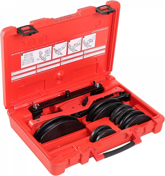 Ручной арбалетный трубогиб Rothenberger Tube Bender Maxi Set 12-15-18-22 мм (Ротенбергер Тюб Бендер Макси Сет 12-15-18-22 мм) предназначен для быстрой и точной гибки до 90° мягких медных и алюминиевых труб, медных труб в оболочке и труб из прецизионной стали, тонкостенных стальных труб, труб из тонкостенной нержавеющей стали Ø 12, 15, 18, 22 мм, толщиной стенки до 1 мм при монтаже систем отопления, водоснабжения, кондиционирования, гидравлических систем, систем подогрева пола и в холодильной технике.